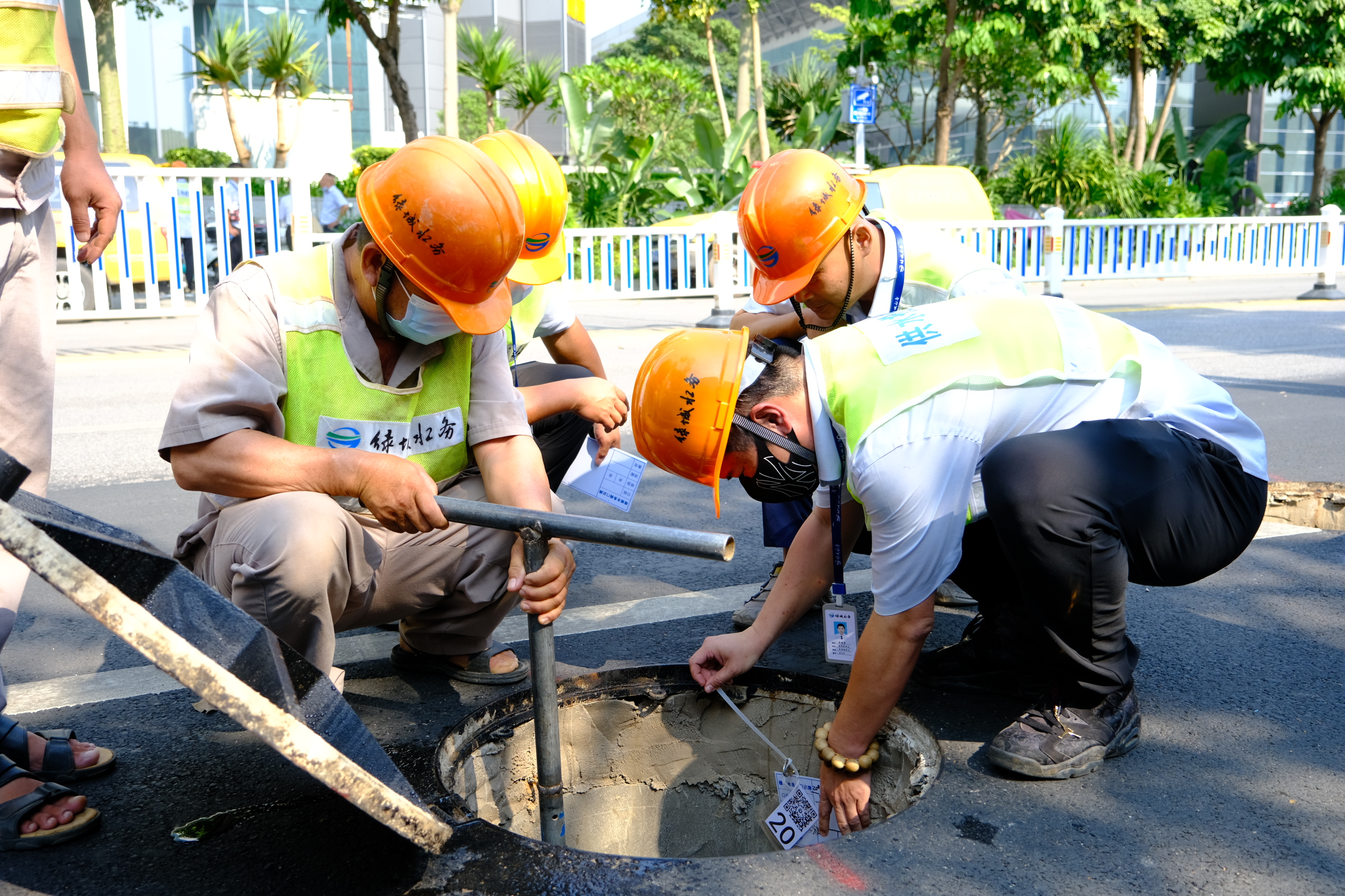 圖為綠城水務(wù)保障人員正在給閥門貼上二維碼,以便突發(fā)爆管時搶修人員快速識別閥門位置及周邊供水管網(wǎng)情況。