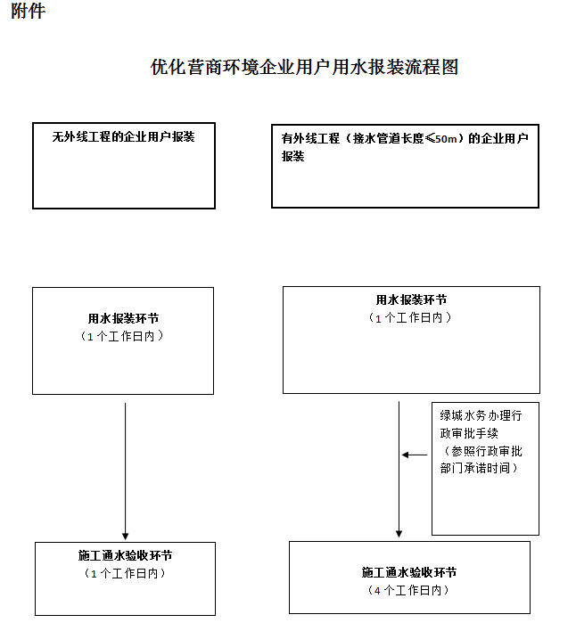 2.施工通水驗收環(huán)節(jié):無外線工程施工通水驗收時間不超過1個工作日,有外線工程(外線工程長度≤50m)施工通水驗收時間不超過4個工作日,不包含辦理行政審批手續(xù)時間。