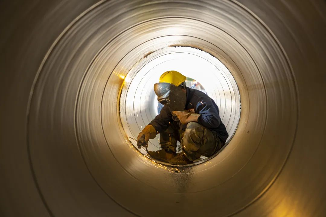 ▲綠城水務(wù)加快推進五象供水加壓站擴建DN1000出水管建設(shè),圖為施工工人正在焊接管道。水建公司 金志華供圖
